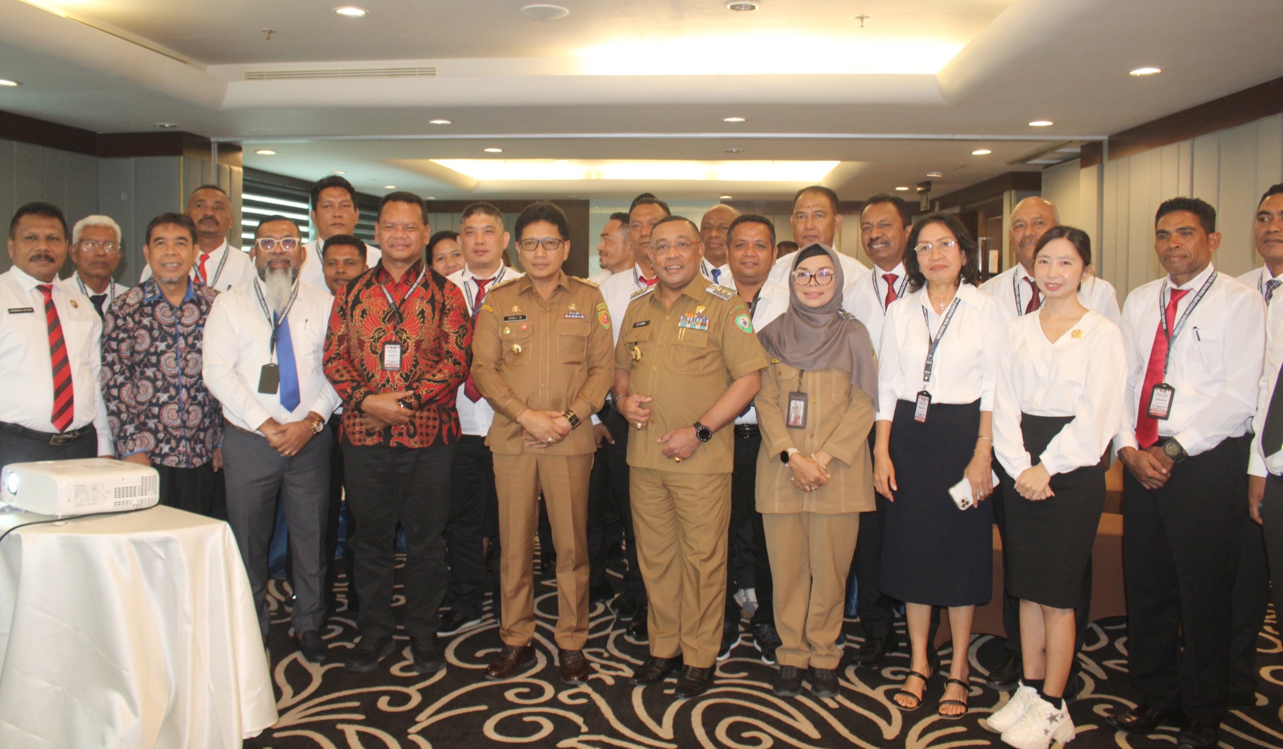 Penjabat Gubernur Maluku Sadli Ie, bersama Penjabat Bupati Maluku Tenggara Samuel Huwae (PDH khaki) dan para peserta serta narasumber dalam orientasi anggota DPRD Malra di Hotel Swissbell Ambon, Selasa (19/11/2024)