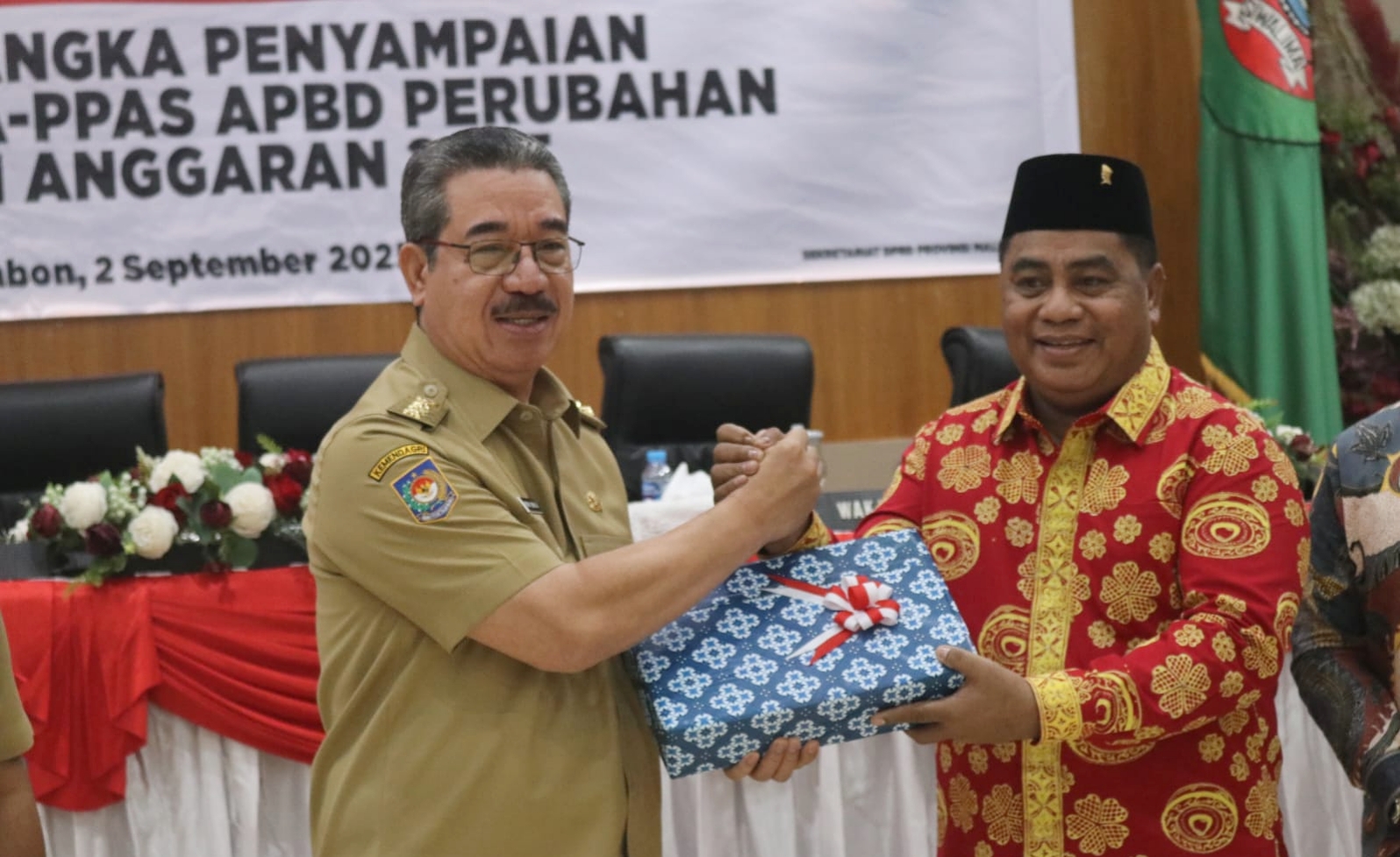 Penyerahan Dokumen KUA-PPAS APBD Perubahan 2025 oleh Gubernur Maluku Hendrik Lewerissa (kiri) kepada Ketua DPRD setempat Benhur Watubun (kanan) dalam rapat paripurna di Karang Panjang Ambon, Selasa (2/9/2025).