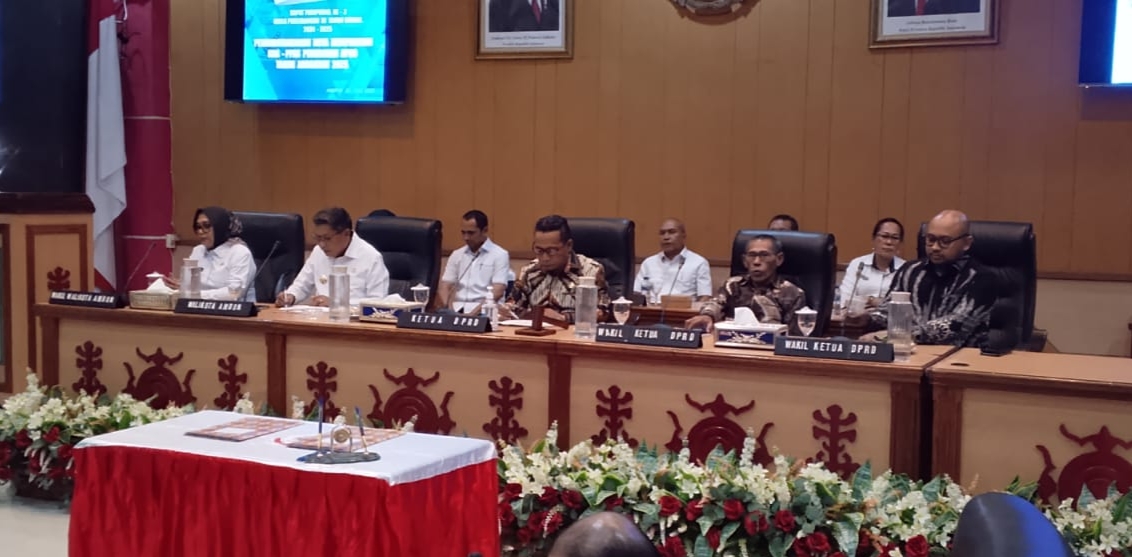 Rapat Paripurna Ke-III Masa Persidangan III tahun 2024/2025 di gedung DPRD Kota Ambon, Rabu (23/7/2025), dengan agenda penandatanganan KUA PPAS Perubahan 2025 antara Wali Kota Ambon Bodewin Wattimena dengan Ketua DPRD setempat Moritz Tamaela.