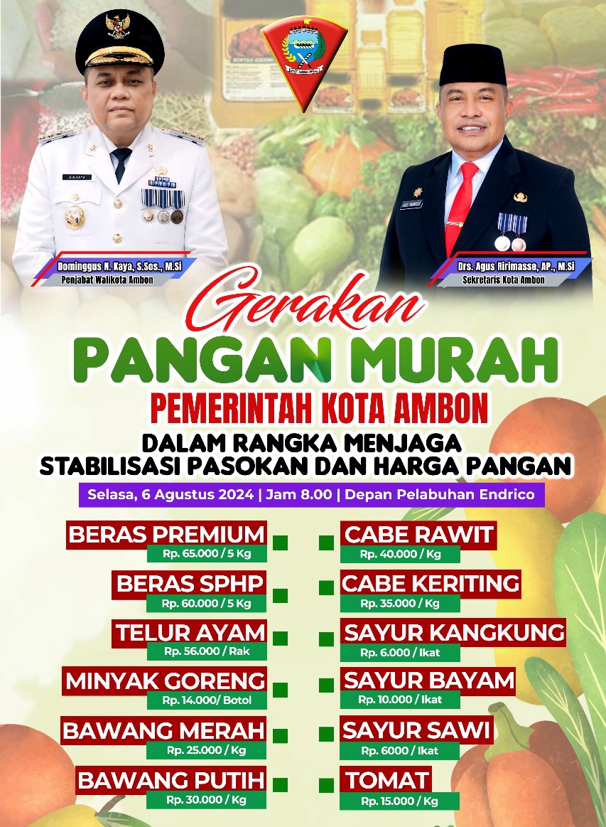 Pelaksana Tugas (Plt) Kepala Dinas Kominfo dan Persandian Kota Ambon, Ronald H. Lekransy, di ruang kerjanya, Senin (5/8/2024) mengatakan, kegiatan pasar murah yang diberi nama Gerakan Pangan Murah (GPM) terus dilakukan oleh Pemerintah Kota dengan tujuan menjaga stabilisasi pasokan dan harga bahan pokok.