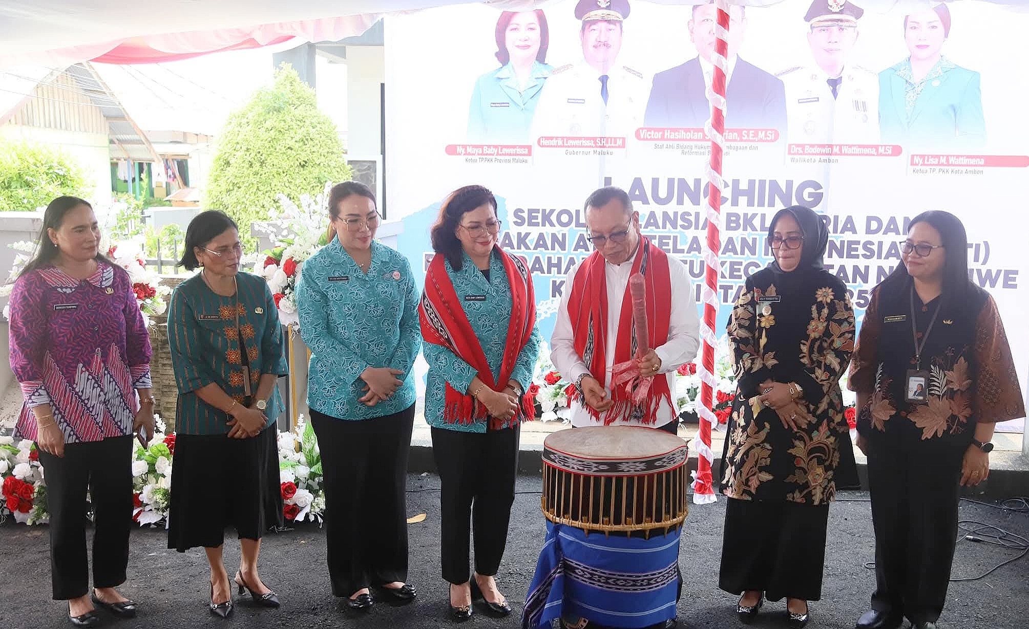 Staf Ahli Bidang Hukum Kelembagaan dan Reformasi Birokrasi Kemendukbangga / BKKBN Viktor Hasiholan Siburian, diapit Ketua TP PKK Provinsi Maluku dan Kota Ambon Maya Baby Lewerissa – Lisa Wattimena (kiri) dan Wakil Wali Kota setempat, Ely Toisuta (kanan) pada peluncuran Sekolah Lansia BKL “Ceria” dan Penguatan GATI di Kawasan OSM Kelurahan Wainitu, Kamis (12/6/2025)