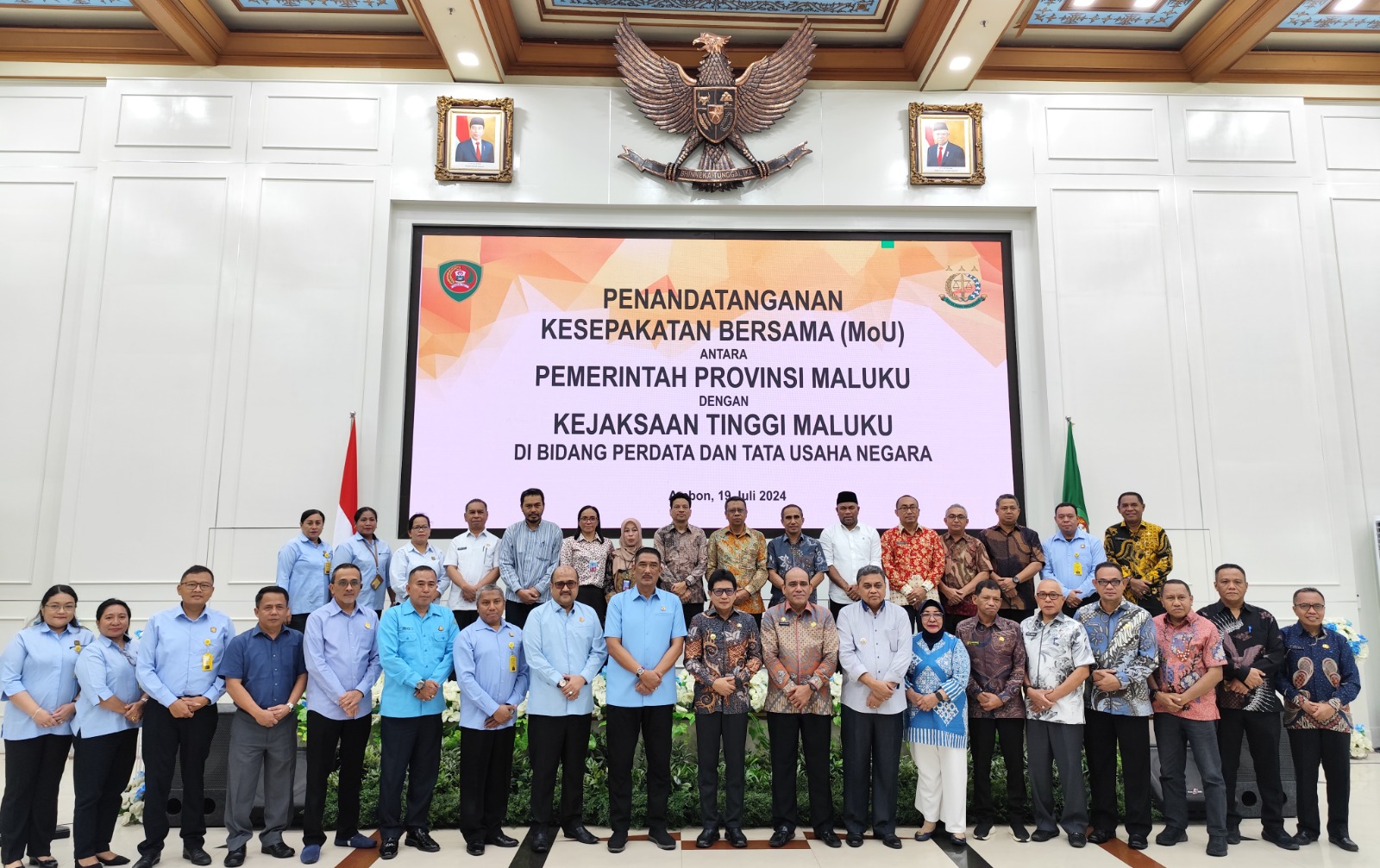 Penandatanganan MoU berlangsung di aula lantai VII Kantor Gubernur Maluku di Ambon, Jumat (19/7/2024) antara Penjabat Gubernur Ir. Sadali Ie, M.Si., IPU, dengan Kepala Kejaksaan Tinggi (Kajati) Maluku Agoes Prasetyo, SH., M.Hum.